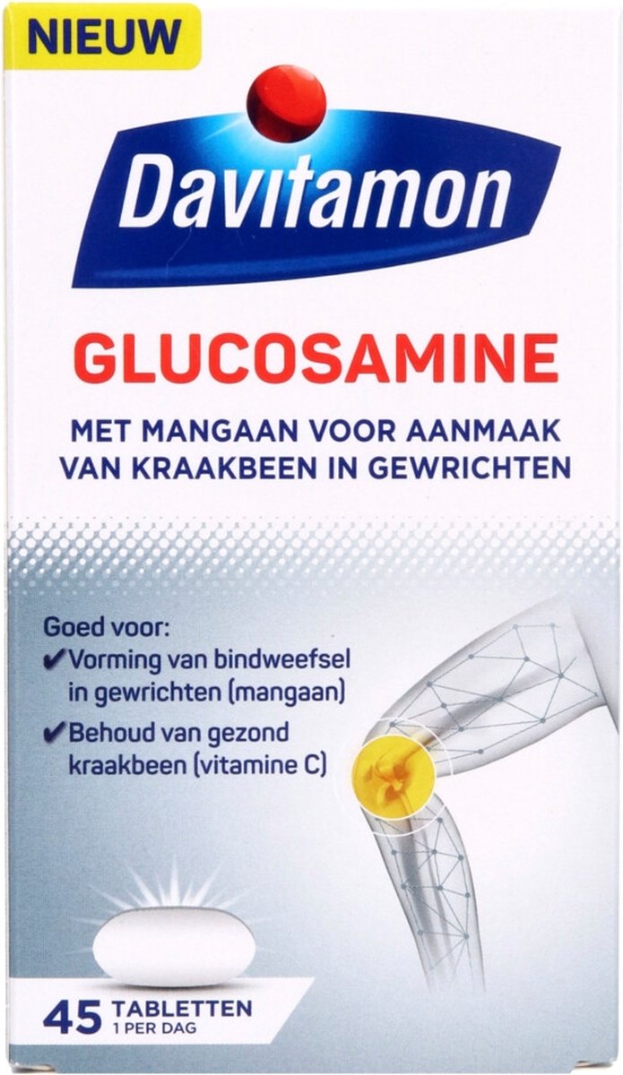 Davitamon Glucosamine is een voedingssupplement dat is samengesteld uit vitamine C, mangaan en glucosaminesulfaat. Het is een aanbevolen supplement, vooral voor personen die last hebben van gewrichtspijn. Het supplement bevat 1500 mg glucosaminesulfaat, wat helpt bij het behoud van gezond kraakbeen. Daarnaast bevat het ook mangaan, wat bijdraagt aan de normale vorming van bindweefsel, en vitamine C, wat goed is voor het behoud van gezond kraakbeen. Met Davitamon Glucosamine kunnen mensen die last hebben van gewrichtspijn de gewrichten soepeler bewegen en gezond kraakbeen behouden. Het is belangrijk om de gewrichten dagelijks te bewegen, daarom is Davitamon Glucosamine een goede keuze voor mensen die hun gewrichten gezond willen houden. Het supplement is verkrijgbaar in 45 tabletten en is eenvoudig te gebruiken.