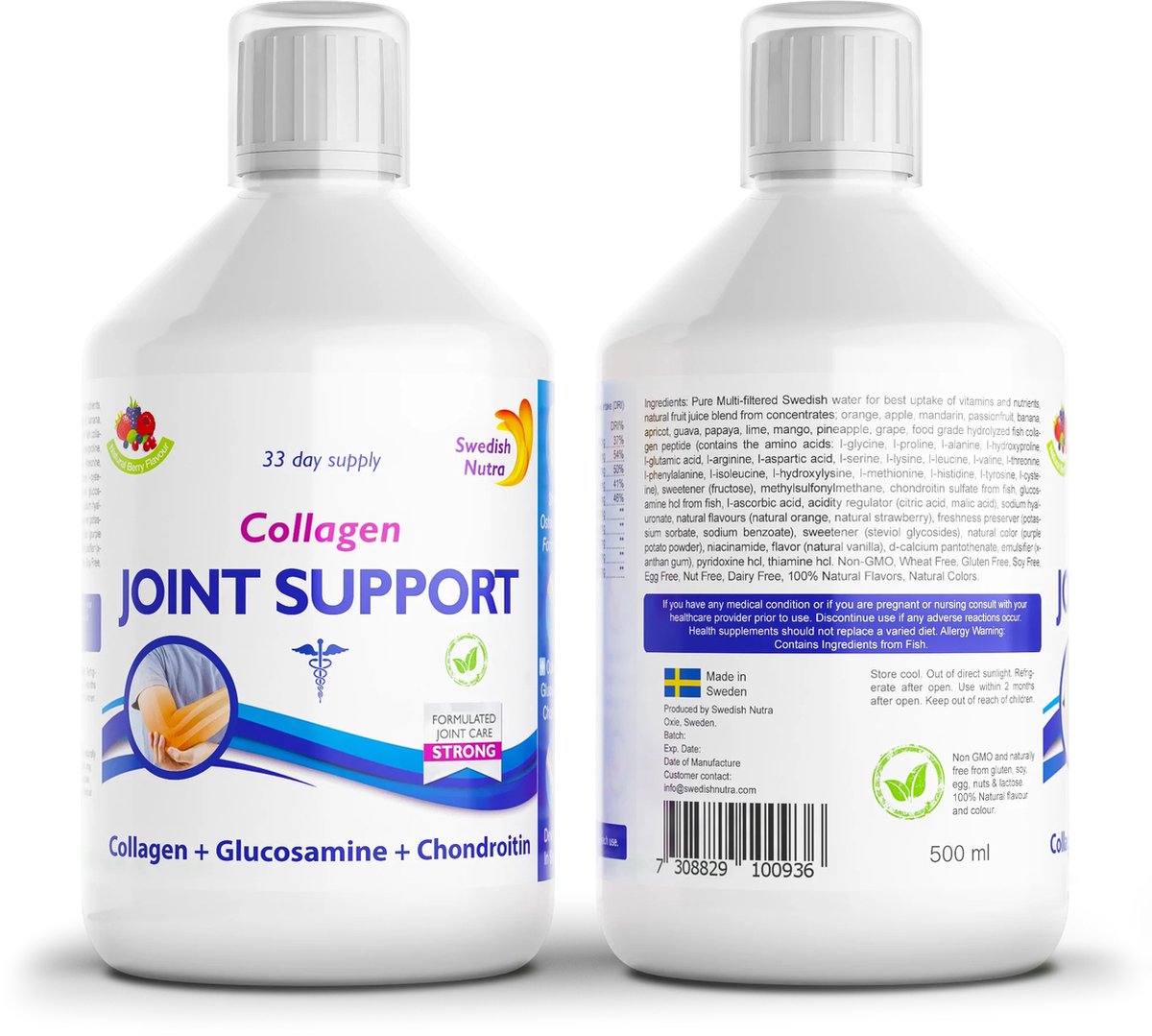 Swedish Nutra Joint Support is een vloeibaar voedingssupplement dat is samengesteld uit gehydrolyseerd collageen type II, kurkuma en vitamine D. Dit supplement is ontworpen om gewrichtspijn te verlichten en bij te dragen aan het herstel van kraakbeen. Swedish Nutra's Joint Support bevat ook een bessensmaak en is een uitstekende keuze om dagelijks te gebruiken om gewrichtspijn, stijfheid en zwelling te verminderen. Het Joint Support-supplement bevat 500 ml en is voldoende voor 33 dagen. Slechts 15 ml per dag levert natuurlijke voedingsstoffen voor gezonde gewrichten en heupen. Dit supplement bevat ook andere actieve ingrediënten zoals boswellia extract, groene thee-extract, hyaluronzuur, glycosaminoglycanen en MSM. Deze ingrediënten werken samen om het kraakbeen te versterken, het herstel van gewrichten te bevorderen en de bloedcirculatie te verbeteren. Bovendien bevordert het gebruik van Swedish Nutra's Joint Support spierfunctie en elasticiteit.